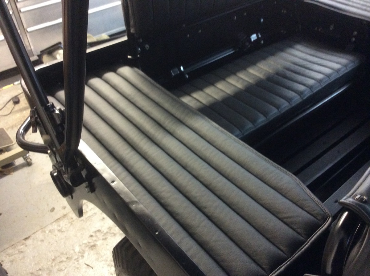 Customised from drab green to Black and Chrome, the interior was retrimmed in black leather and the hood completely remade by hand. The dials were customised in to “Brietling” yellow and a “Wagmann/Brietling clock from a 1960’s American jet fighter added.